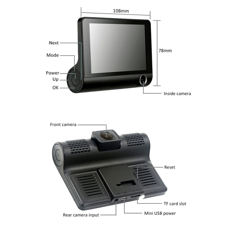 4.0 inch IPS Screen 5.0 Mega Pixels 170 Degrees Wide Angle Full HD 1080P 3 Channels Video Car DVR, Support Night Vision Fill Light / Reversing Visual / TF Card(32GB Max) / G-sensor / Motion Detection