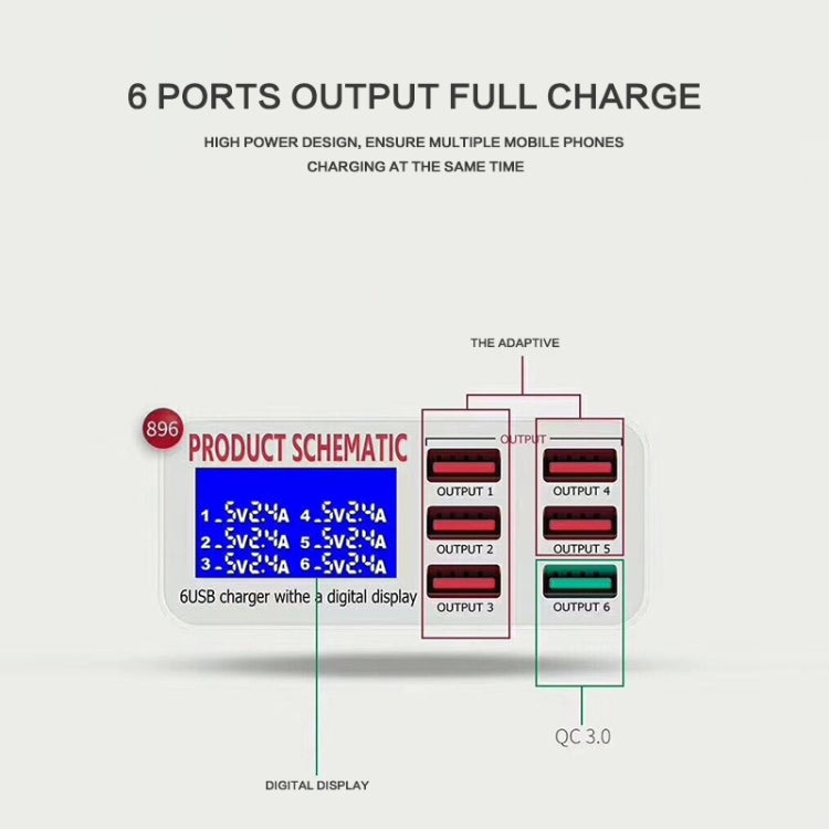 896 40W QC 3.0 6 USB Ports Fast Charger with LCD Digital Display, EU Plug(White)