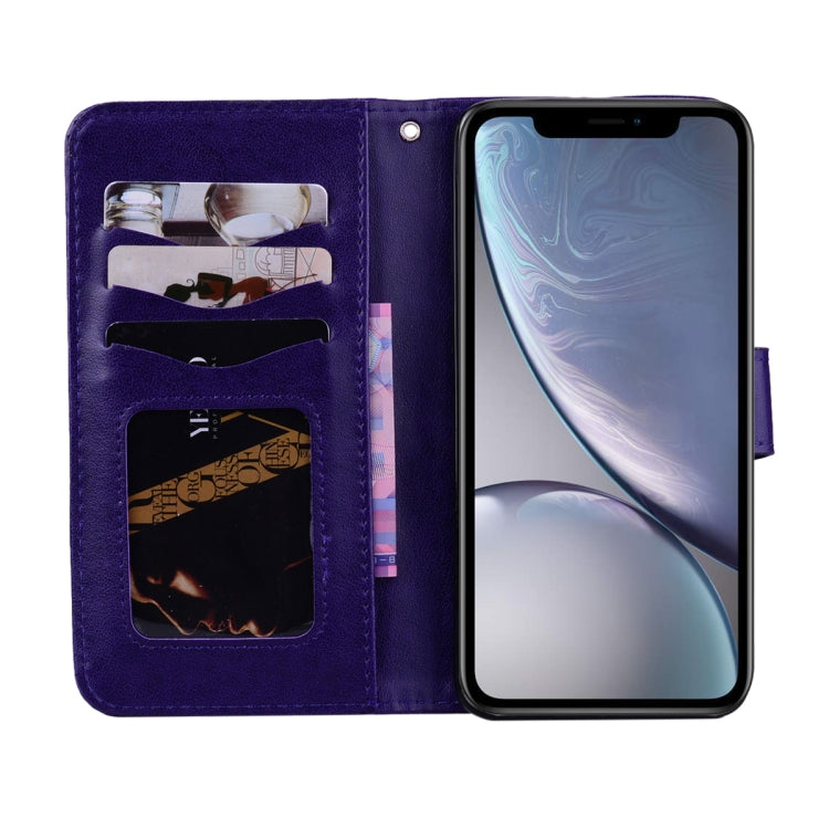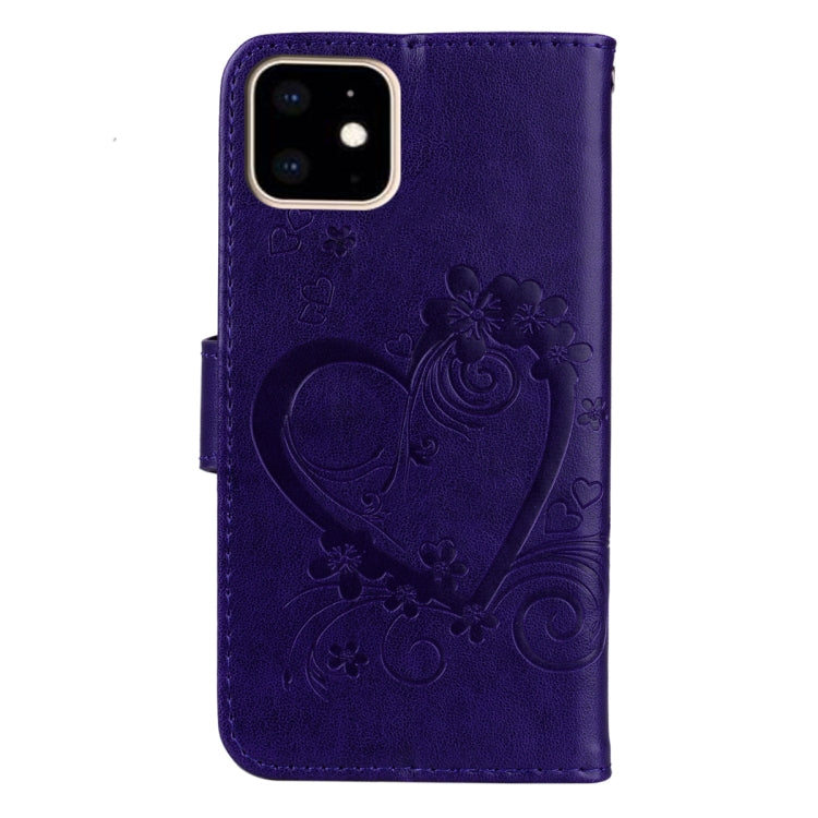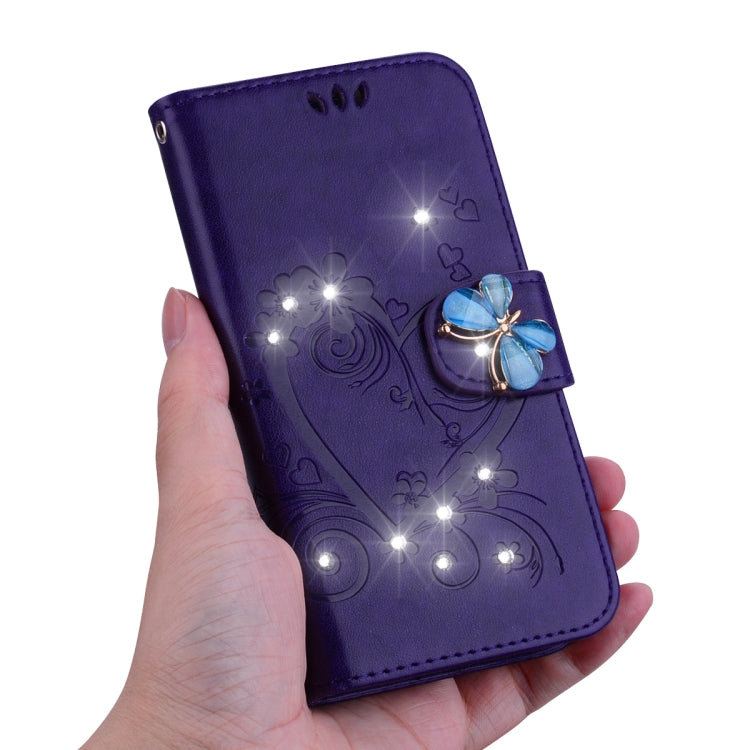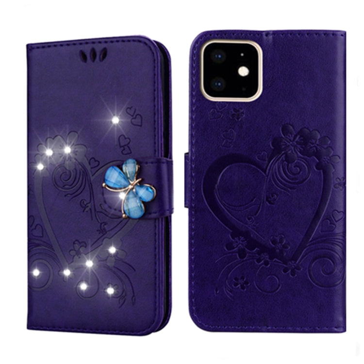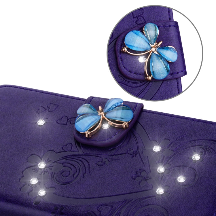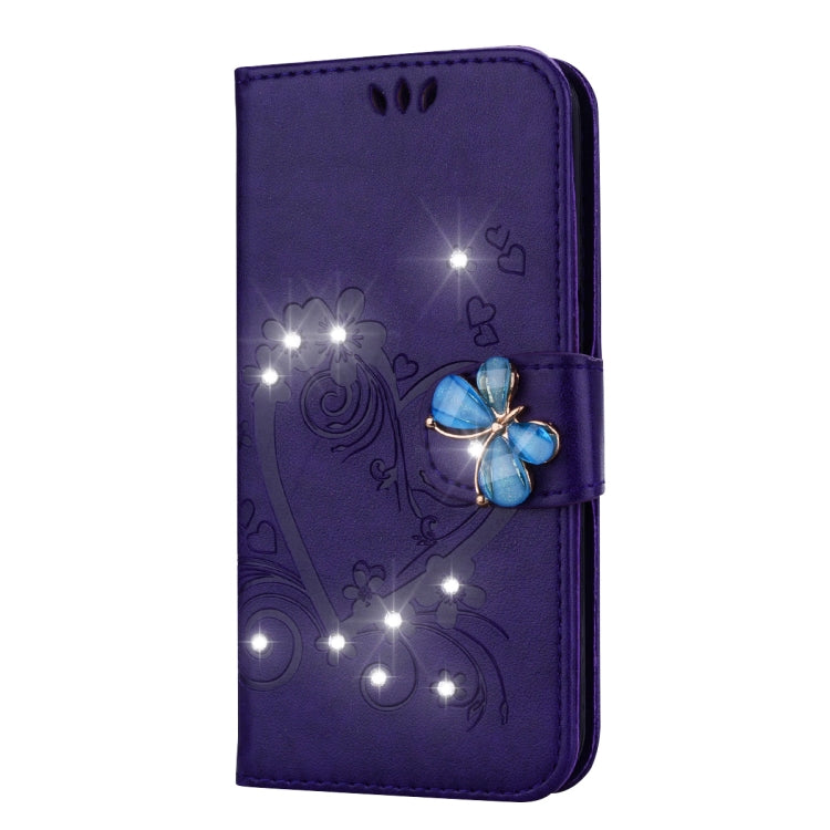 For iPhone 11 Pro Max Embossed Heart Butterfly Pattern Diamond Encrusted Leather Case with Holder & Card Slots(Violet)