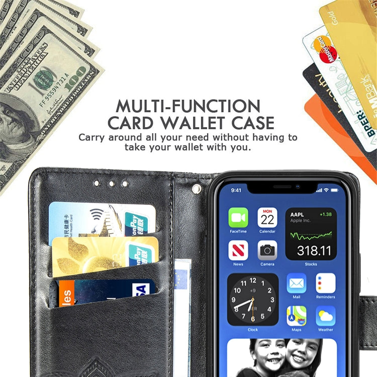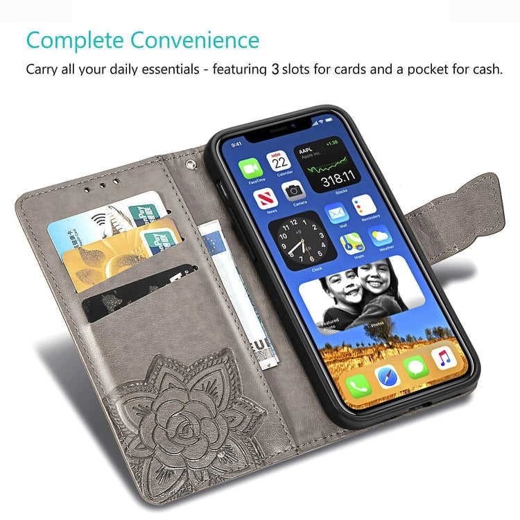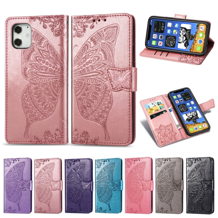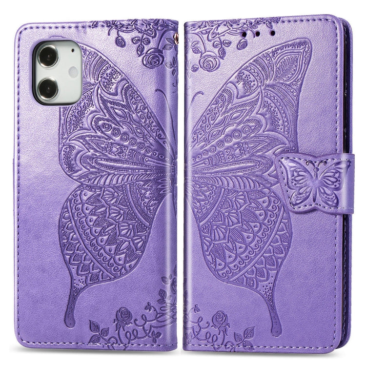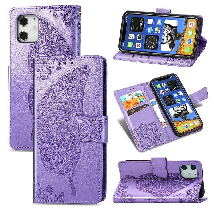 For iPhone 12 5.4 Inch Butterfly Love Flower Embossed Horizontal Flip Leather Case with Bracket / Card Slot / Wallet / Lanyard(Light Purple)