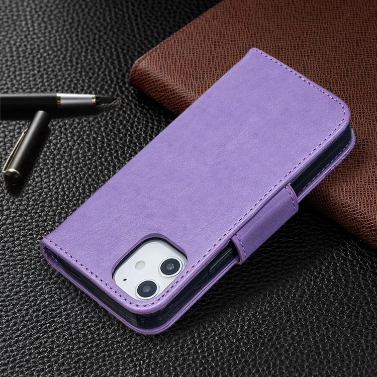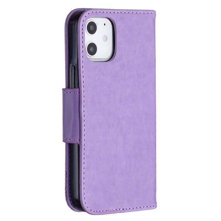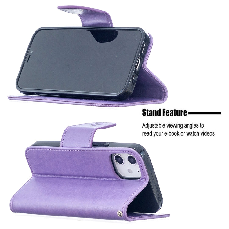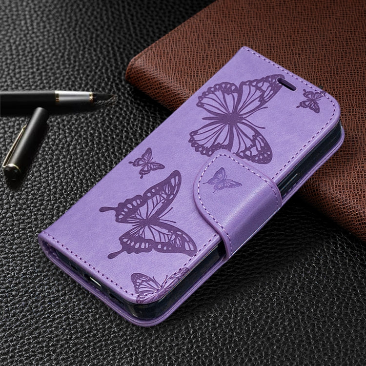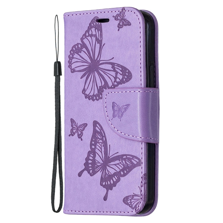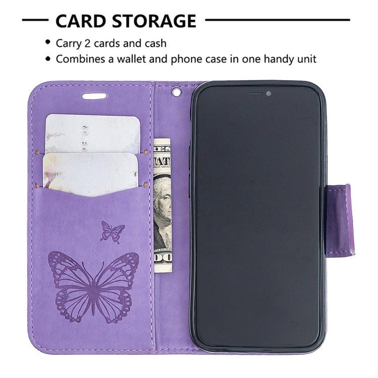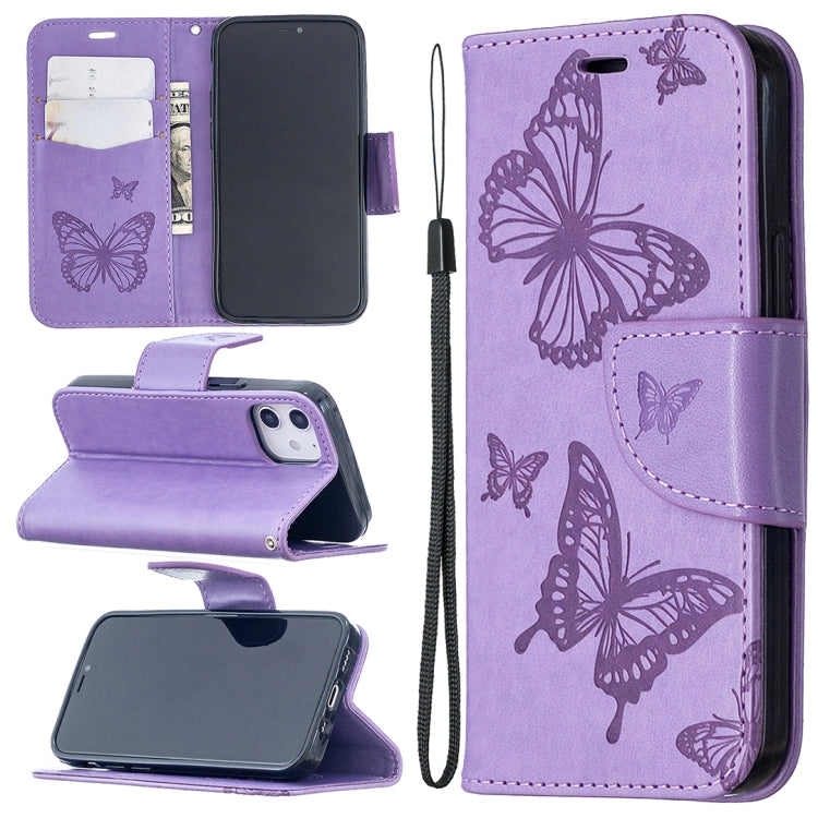 For iPhone 12 Embossing Two Butterflies Pattern Horizontal Flip PU Leather Case with Holder & Card Slot & Wallet & Lanyard(Purple)