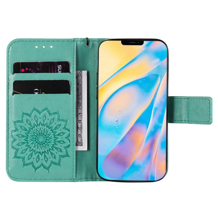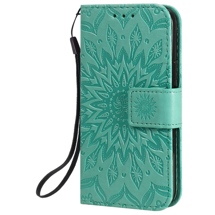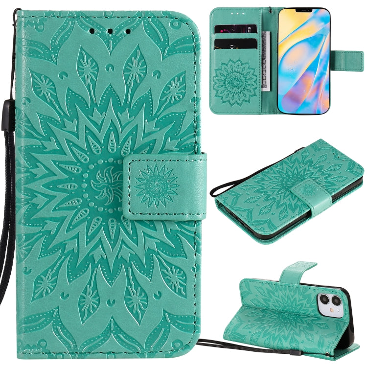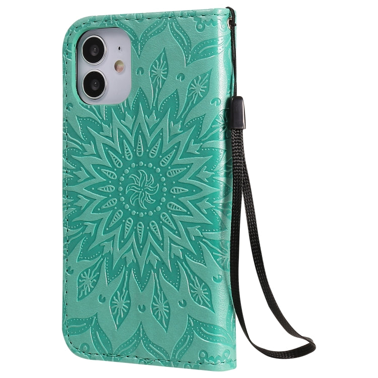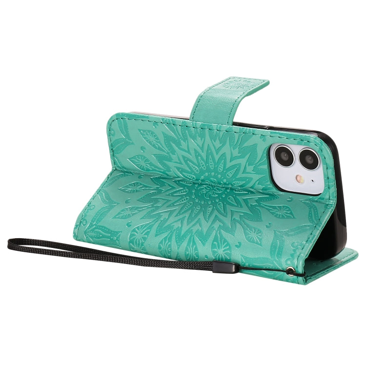 For iPhone 12 Pressed Printing Sunflower Pattern Horizontal Flip PU Leather Case Holder & Card Slots & Wallet & Lanyard(Green)