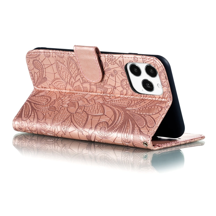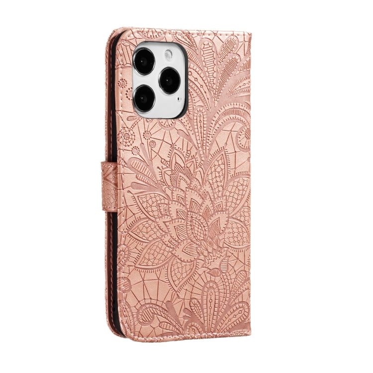 For iPhone 12 Pro Max 6.7 Lace Flower Horizontal Flip Leather Case with Holder & Card Slots & Wallet & Photo Frame(Rose Gold)