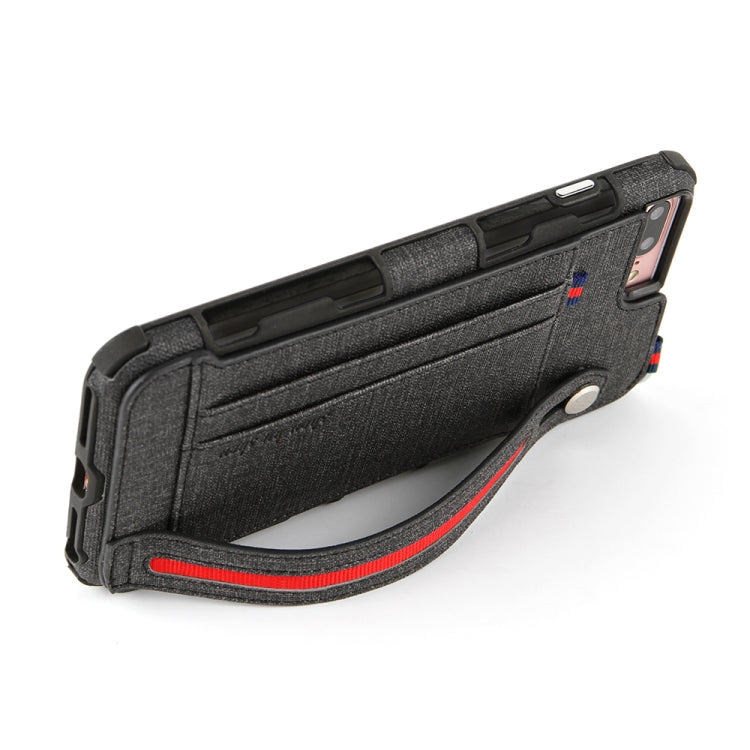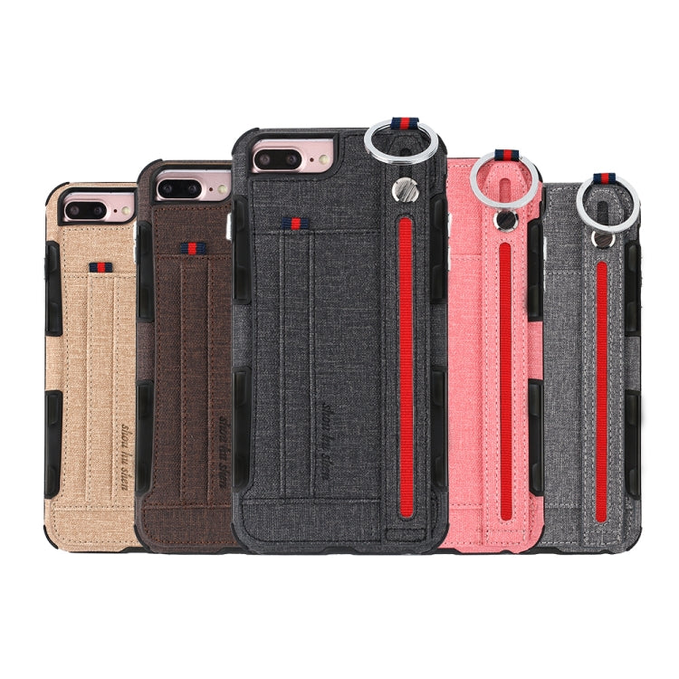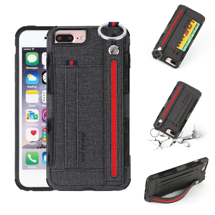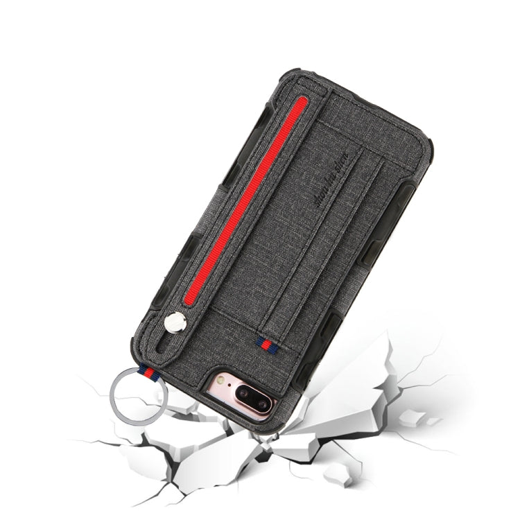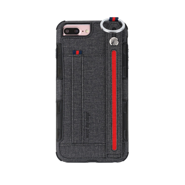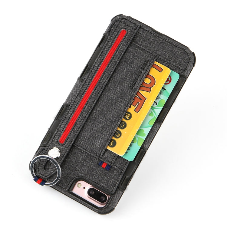 For iPhone 8 Plus & 7 Plus Cloth Texture + TPU Shockproof Protective Case with Metal Ring & Holder & Card Slots & Hanging Strap(Black)
