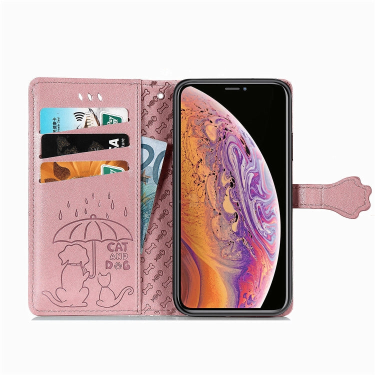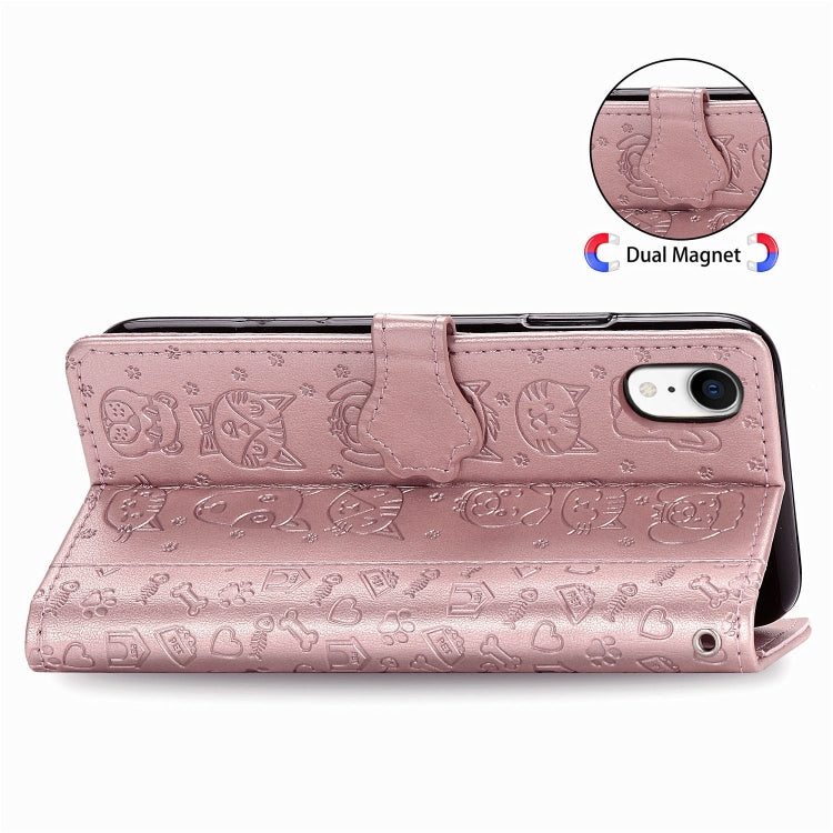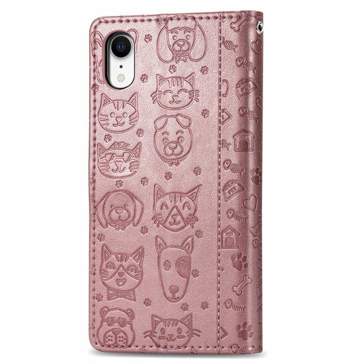 For iPhone XR Cute Cat and Dog Embossed Horizontal Flip PU Leather Case with Holder / Card Slot / Wallet / Lanyard(Rose Gold)