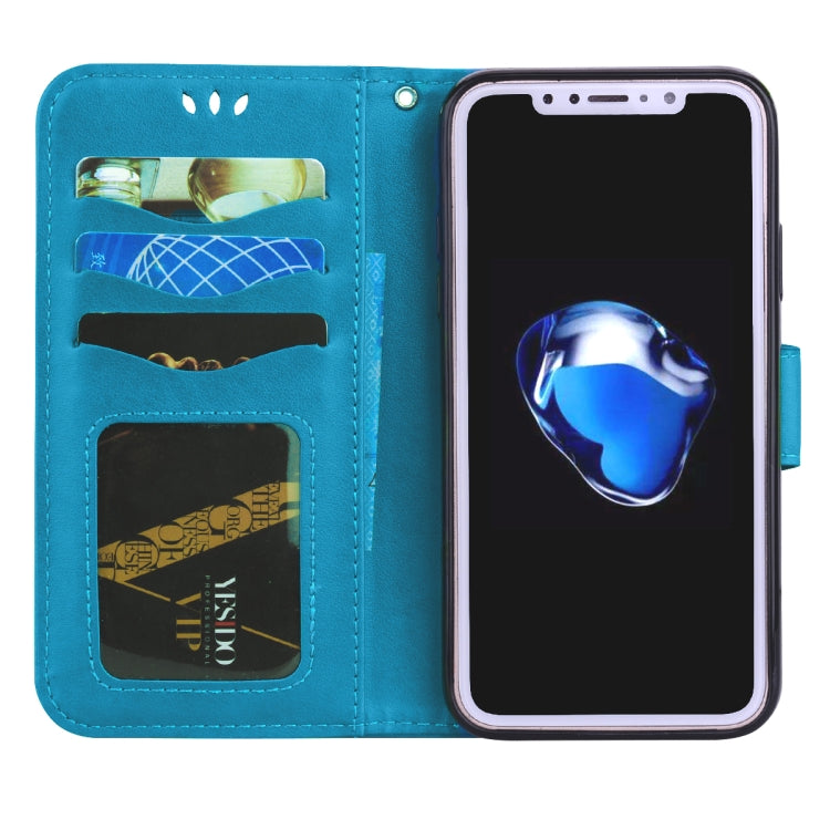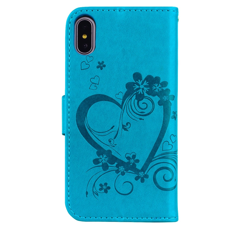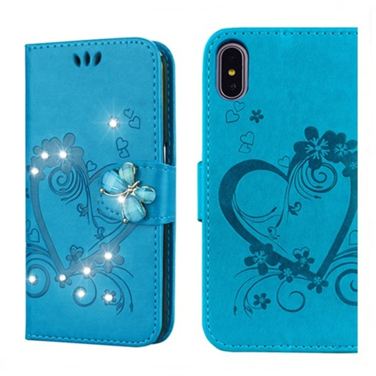 For iPhone XS Max Embossed Heart Butterfly Pattern Diamond Encrusted Leather Case with Holder & Card Slots(Blue)