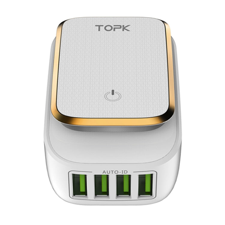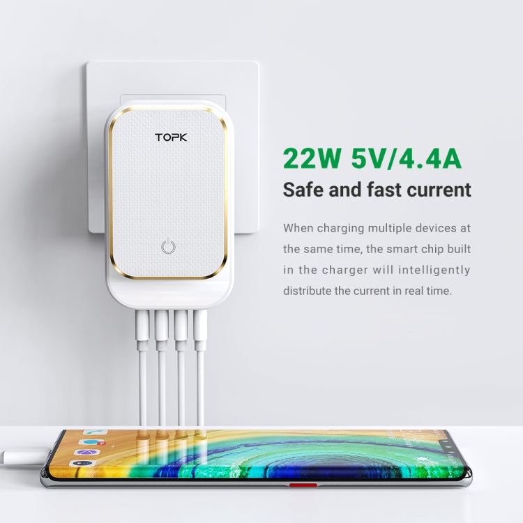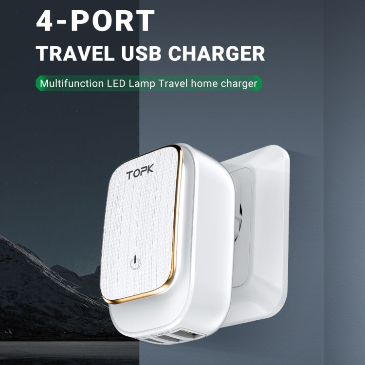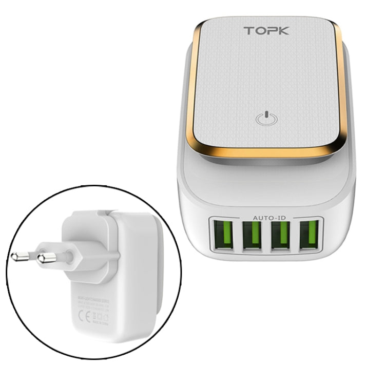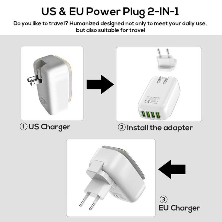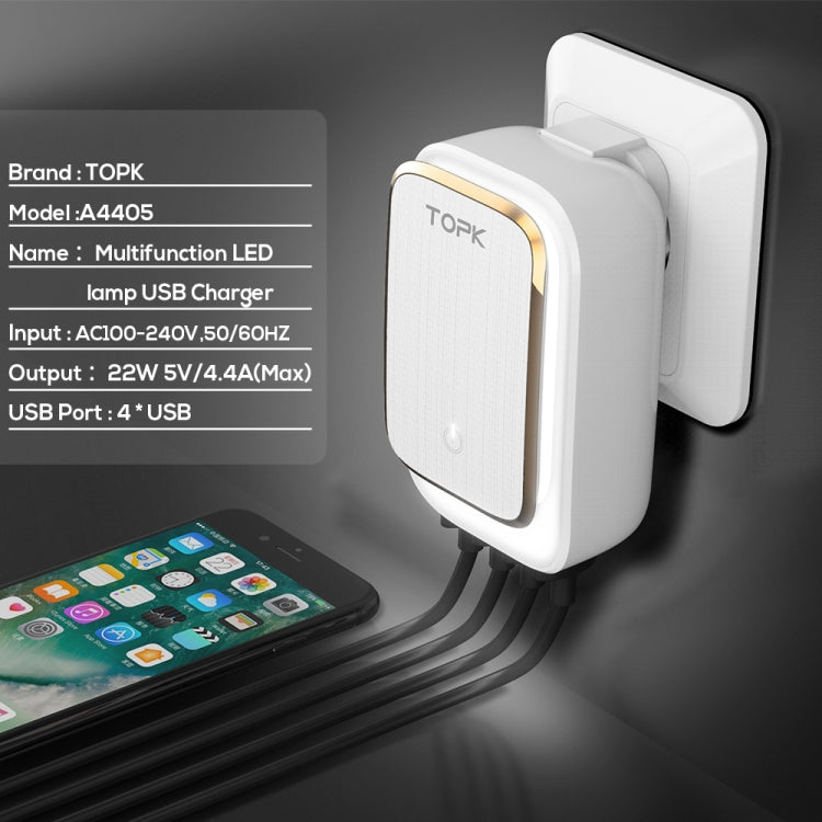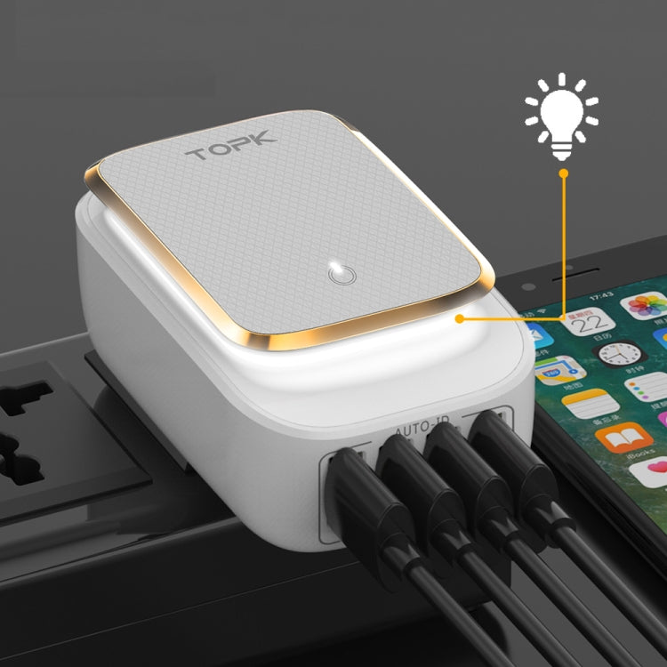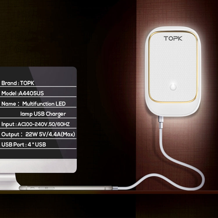 TOPK 4405 4.4A 4 Ports LED Light USB Charger Travel Adapter, US Plug + EU Conversion Head