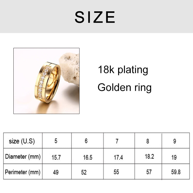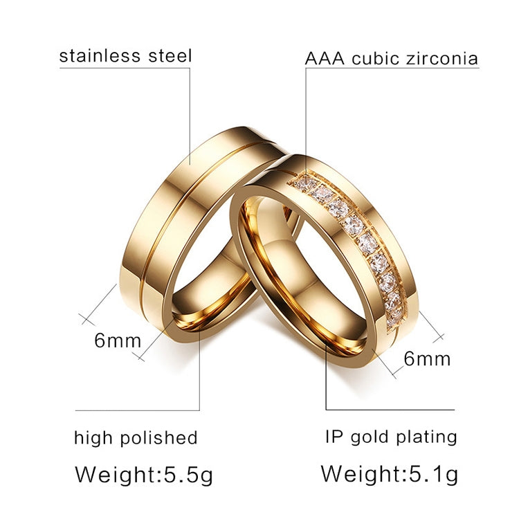 Fashion 18K Plating Female Golden Ring High Polished Stainless Steel + Cubic Zirconia Lovers Ring, Size: 9, Diameter: 19mm, Perimeter: 59.8mm