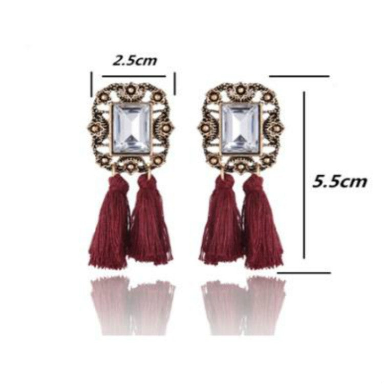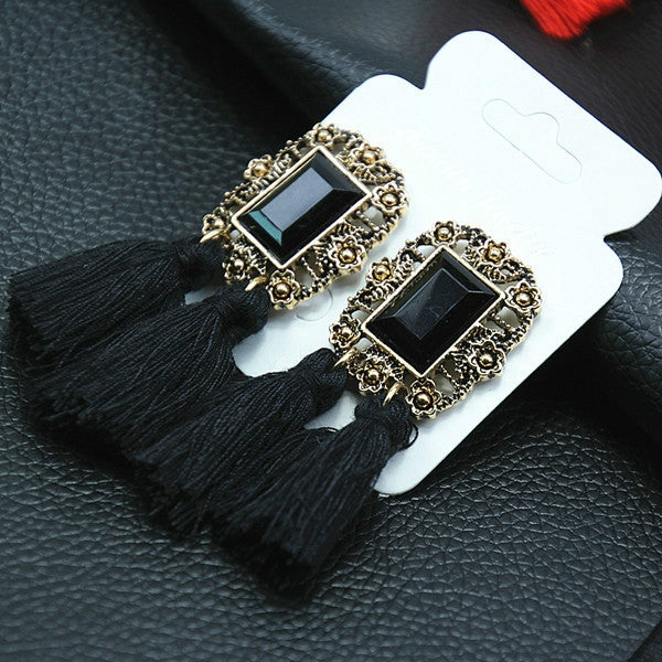 Gemstone Court Fringe Long Earrings Bohemian Tassels Fringe Exaggerated Vintage Stud Earrings(Black)