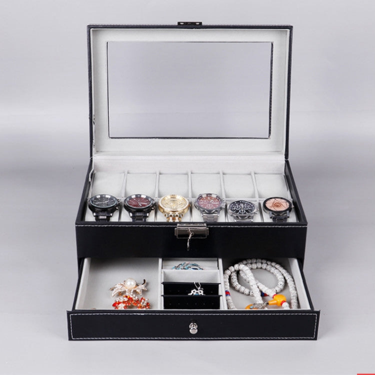 PU Leather 12-bit Watch Box Double-layer Jewelry Box Storage Display Box(Black)
