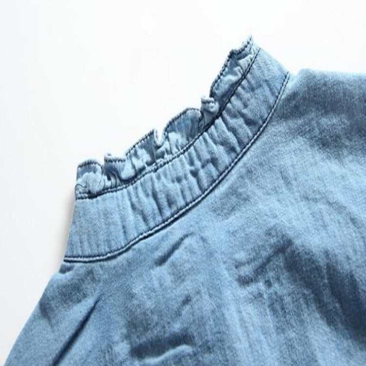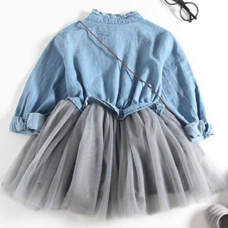 Spring and Summer Girls Long-sleeved Denim Stitching Mesh Dress, Size:120cm(Dark Blue)