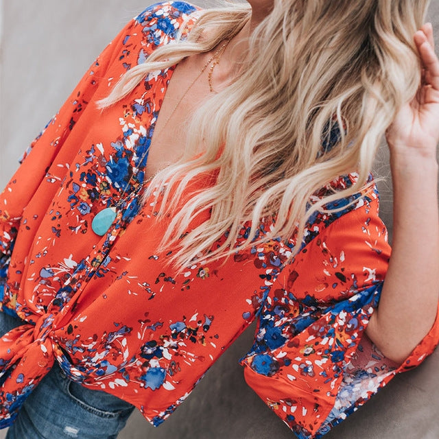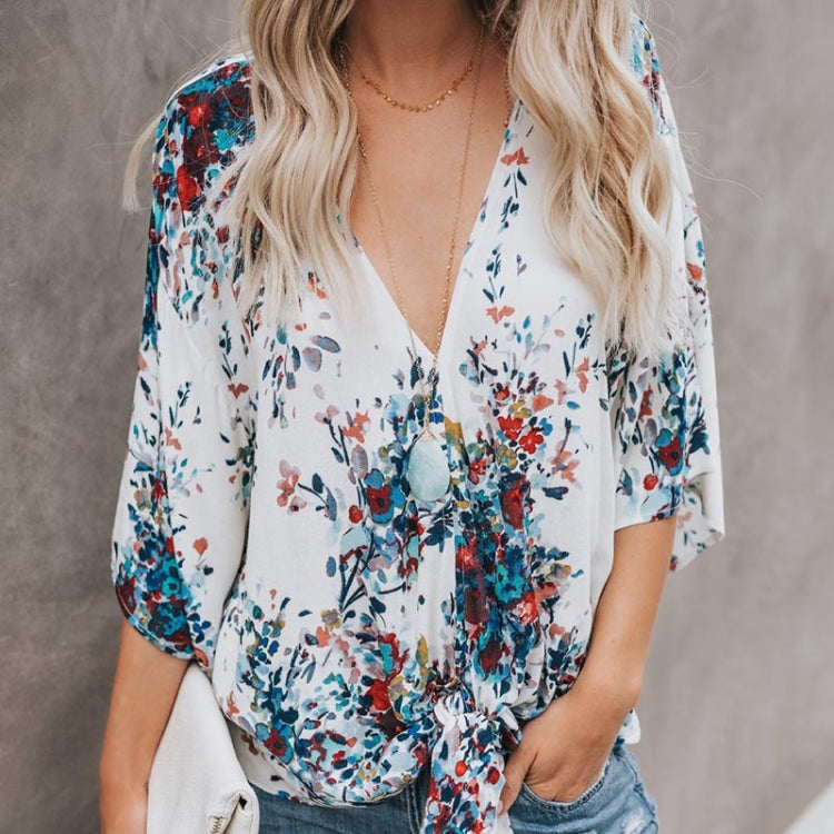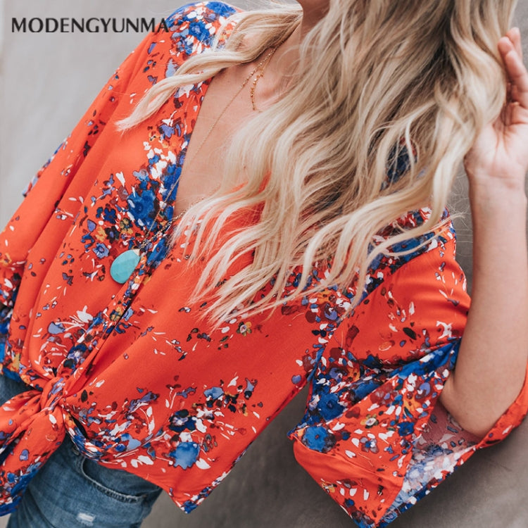 V-neck Chiffon Blouse Casual Shirts Loose Tops Floral Clothes, Size:M(Red)
