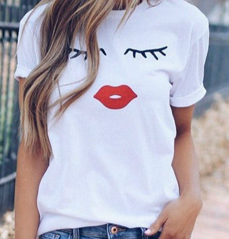 Women Printed Eyelashes Red Lips Joker Casual Short Sleeve T-Shirt, Size:XXL(White)