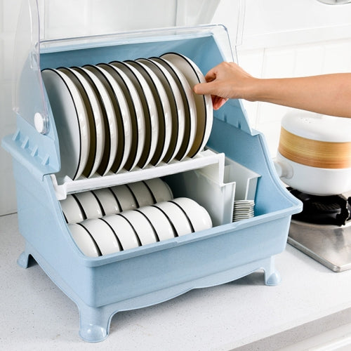 Multifunctional Kitchen Tableware Bowls Chopsticks Storage Box Large Double-layer Drain Rack With Lid(Blue)
