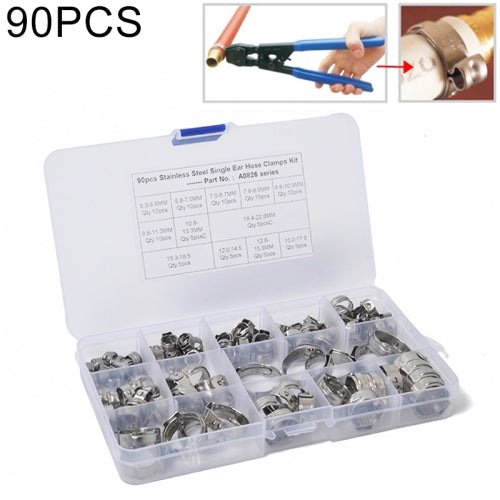 90 PCS Adjustable Single Ear Plus Stainless Steel Hydraulic Hose Clamps O-Clips Pipe Fuel Air, Inside Diameter Range: 5.3-22.6mm