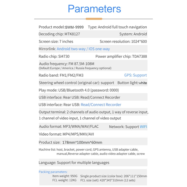 9999 7 inch HD Universal Car Android Radio Receiver MP5 Player, Support FM & Bluetooth & TF Card & GPS & Phone Link & WiFi