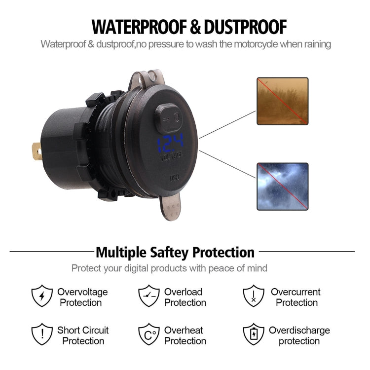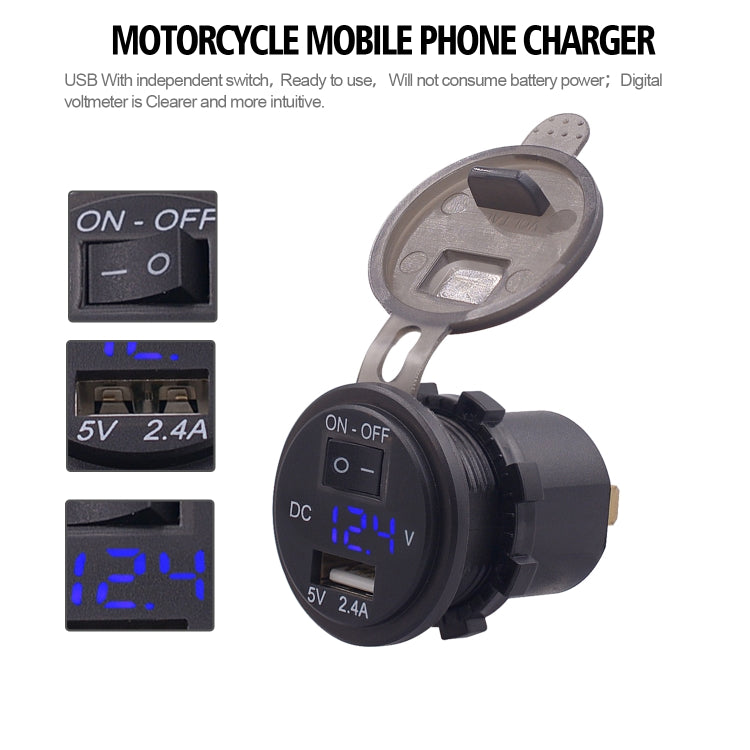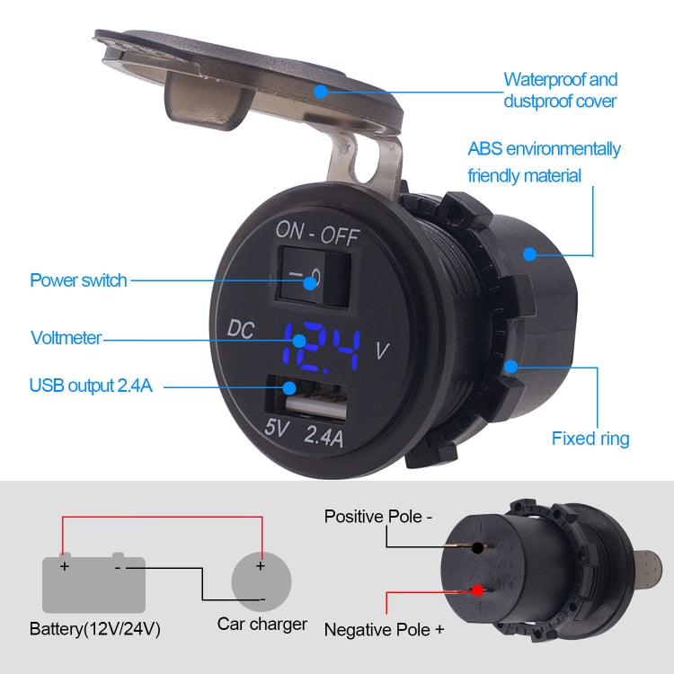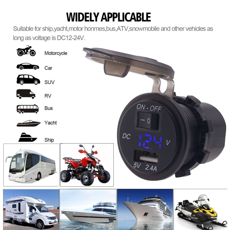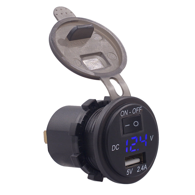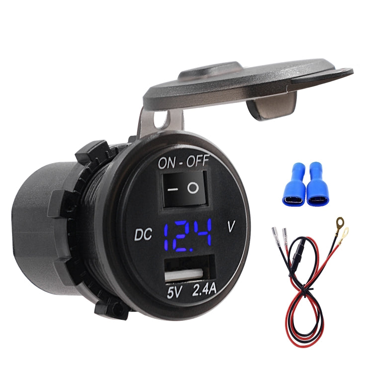 Universal Car Single Port USB Charger Power Outlet Adapter 2.4A 5V IP66 with LED Digital Voltmeter + Switch + 60cm Cable (Blue Light)