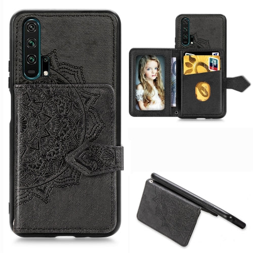 For Huawei Honor 20 Pro Mandala Embossed Magnetic Cloth PU + TPU + PC Case with Holder & Card Slots & Wallet & Photo Frame & Strap(Black)