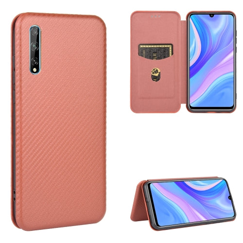 For Huawei Y8p / Enjoy 10S Carbon Fiber Texture Magnetic Horizontal Flip TPU + PC + PU Leather Case with Card Slot(Brown)