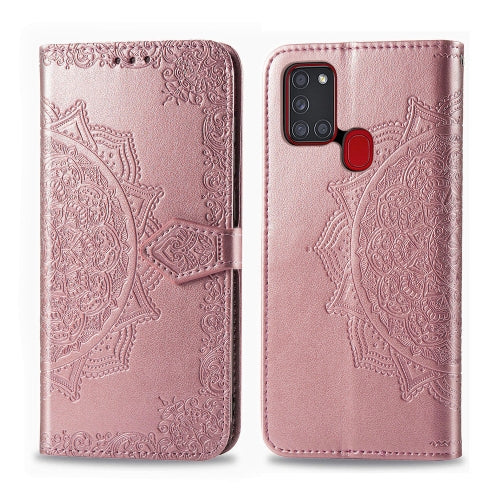 For Samsung Galaxy A21s Halfway Mandala Embossing Pattern Horizontal Flip PU Leather Case with Card Slots & Holder & Wallet(Rose Gold)