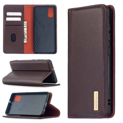 For Samsung Galaxy A41 2 in 1 Detachable Magnetic Horizontal Flip Genuine Leather Case with Holder & Card Slots & Wallet(Dark Brown)