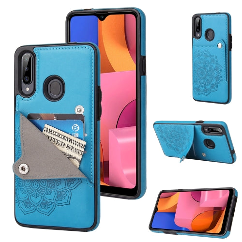 For Samsung Galaxy A20s Embossed Pattern PU + TPU Protective Case with Holder & Wallet & Card Slots(Blue)