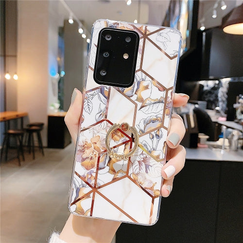 For Galaxy S20 Plus Plating Geometric Flower Series IMD TPU Mobile Phone Case with Ring Rhinestones Holder(Gold)