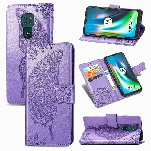 For Moto G9 Play Butterfly Love Flower Embossed Horizontal Flip Leather Case with Bracket / Card Slot / Wallet / Lanyard(Light Purple)