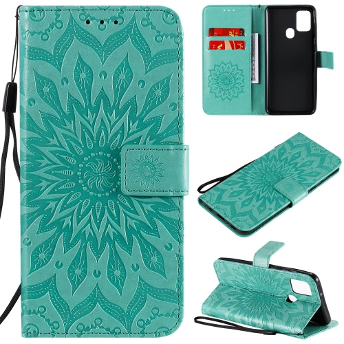 For Samsung Galaxy A21s Embossed Sunflower Pattern Horizontal Flip PU Leather Case with Holder & Card Slots & Wallet & Lanyard(Green)