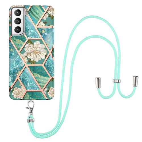 For Samsung Galaxy S21 FE 5G Electroplating Splicing Marble Flower Pattern TPU Shockproof Case with Lanyard(Blue Flower)
