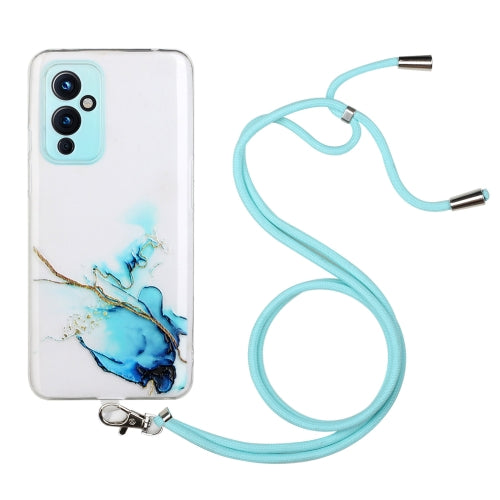 For OnePlus 9 Hollow Marble Pattern TPU Precise Hole Protective Case with Neck Strap Rope(Blue)