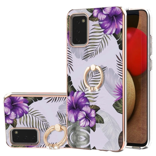 For Samsung Galaxy A02s 166mm Electroplating Pattern IMD TPU Shockproof Case with Rhinestone Ring Holder(Purple Flower)