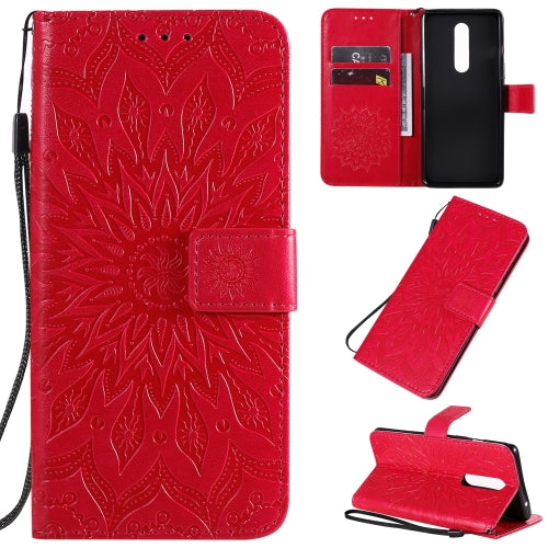 For OnePlus 8 Pressed Printing Sunflower Pattern Horizontal Flip PU Leather Case with Holder & Card Slots & Wallet & Lanyard(Red)